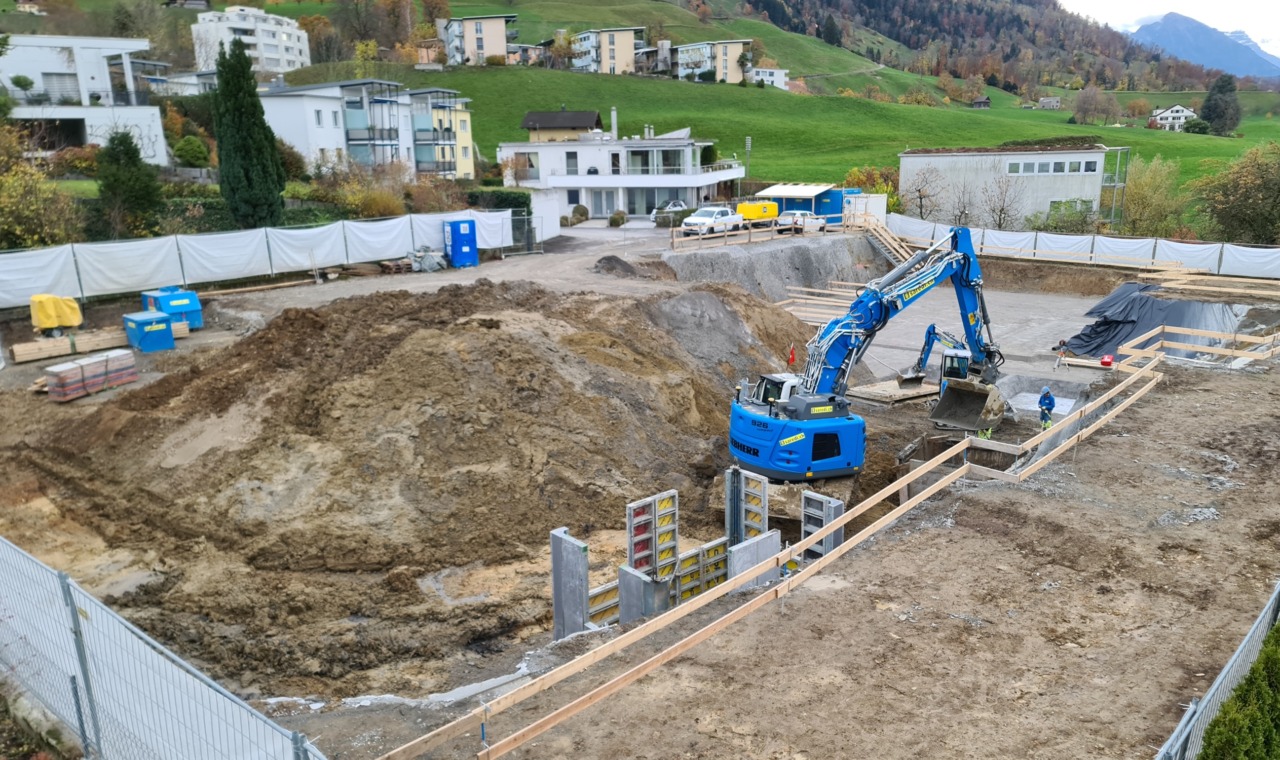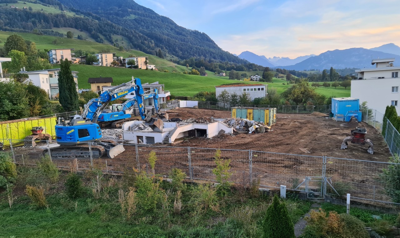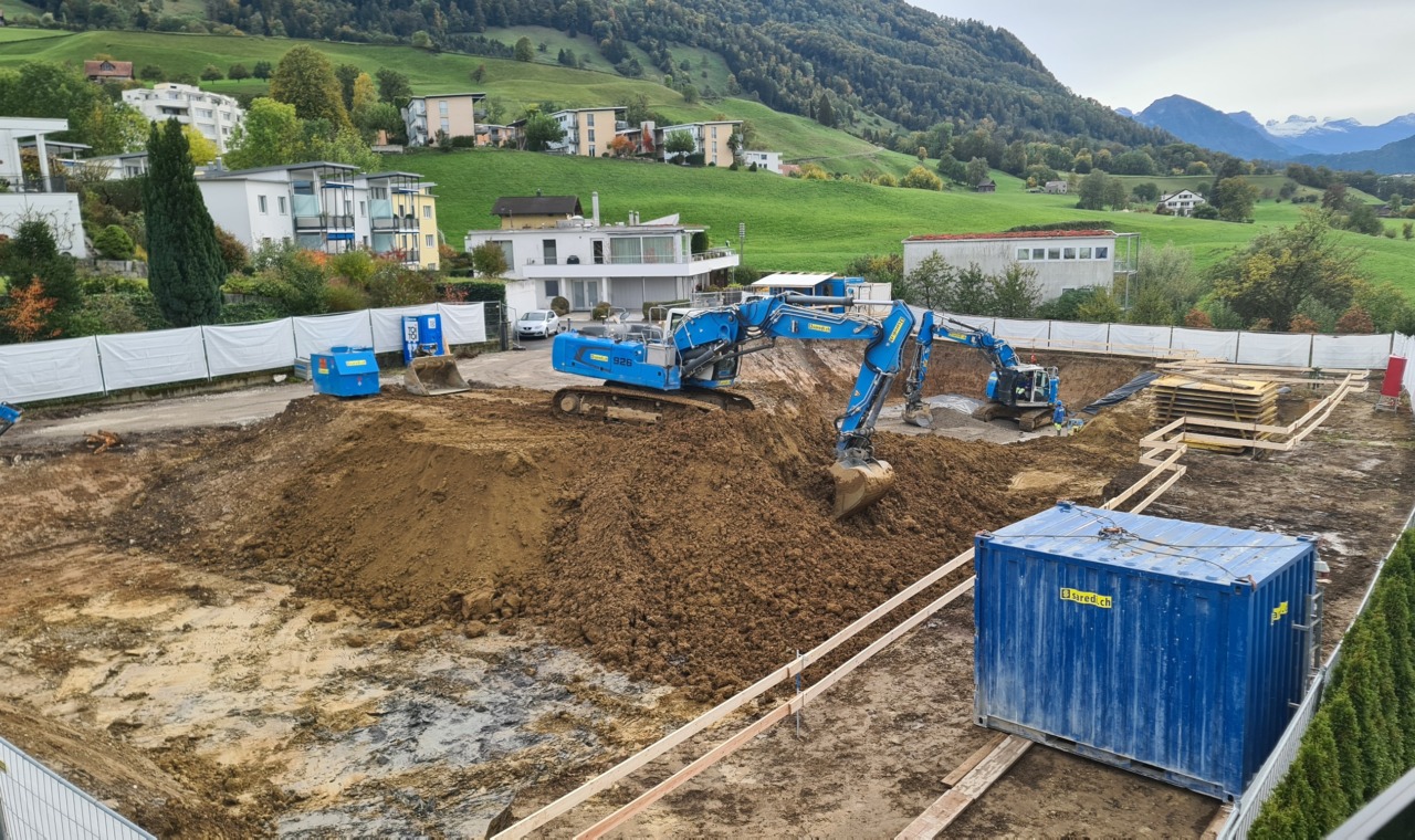 In der Honegg in Küssnacht führte Saredi für den Bauherrn die vollständigen Abbruch- und Aushubarbeiten aus. Der Aushub für die grosse Einstellhalle mit Kellern bildete die Grundlage dafür, dass anschliessend fünf Einfamilienhäuser realisiert werden konnten.