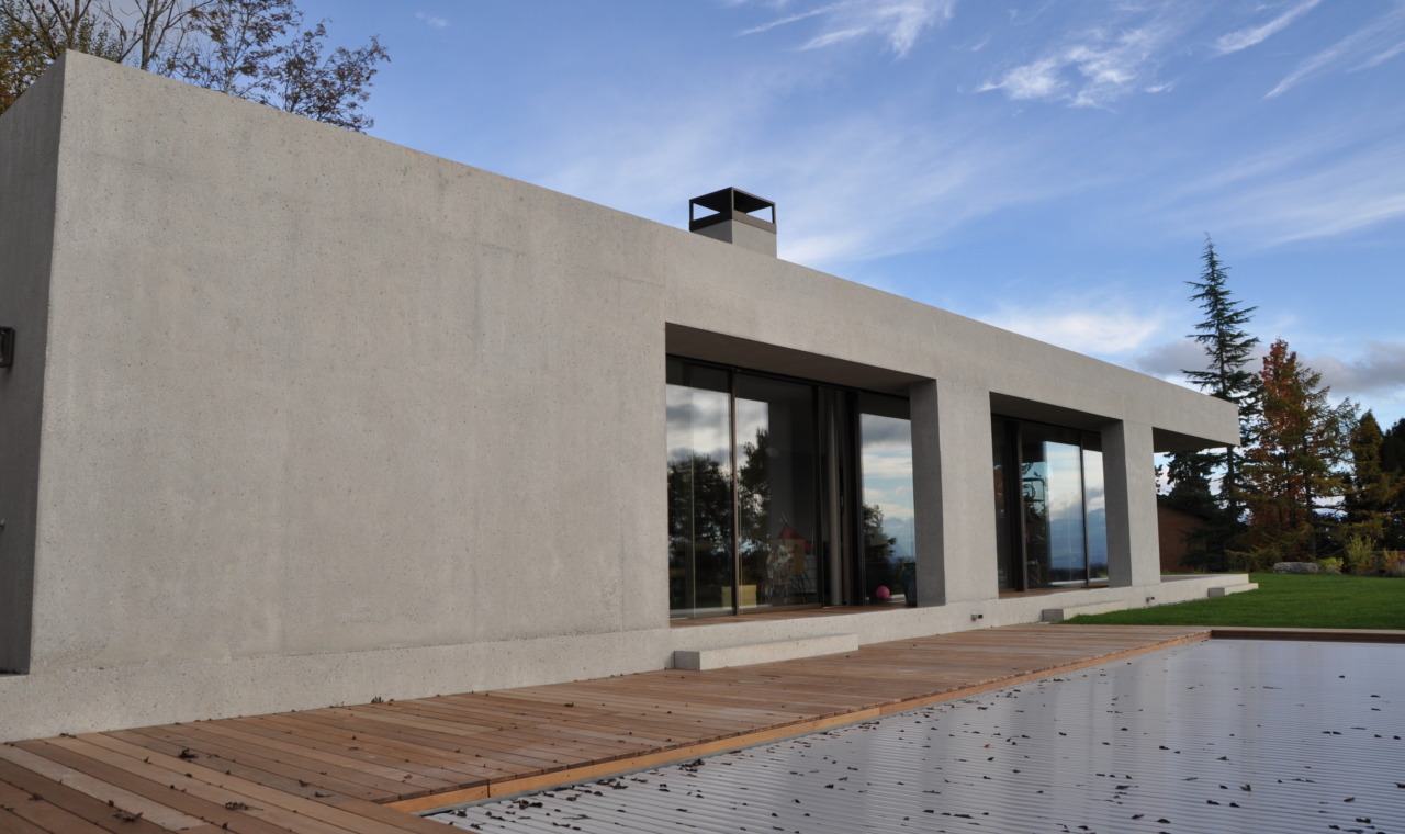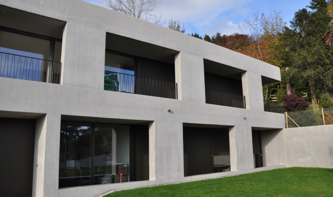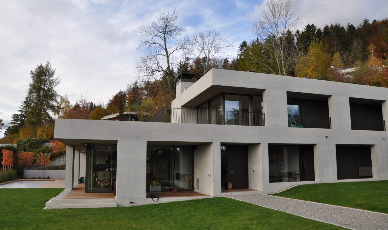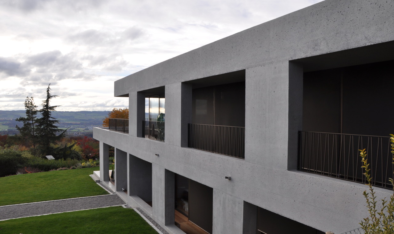 Das Haus Aeugst zeichnet sich durch seine exponierte Lage mit Panoramablick aus. Die prägnante Sichtbetonfassade in Kombination mit der zurückgesetzten Hebeschiebefront generiert eine überdeckte Loggia, die als räumliche Schnittstelle zwischen Innen- und Außenraum fungiert und den Landschaftsbezug architektonisch inszeniert.