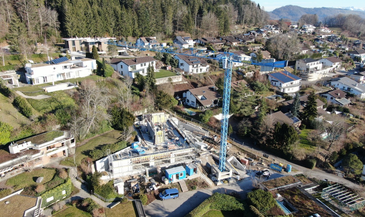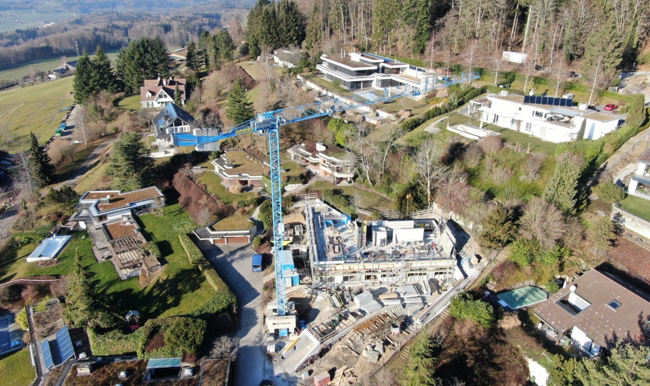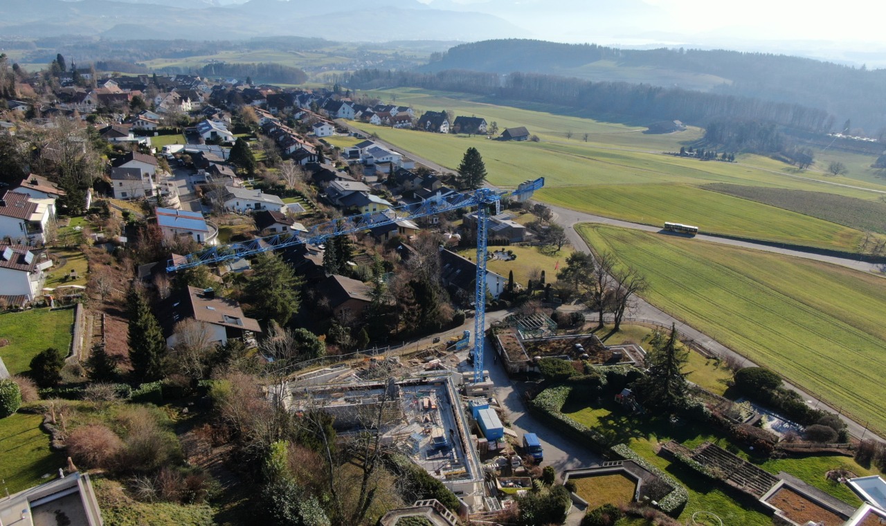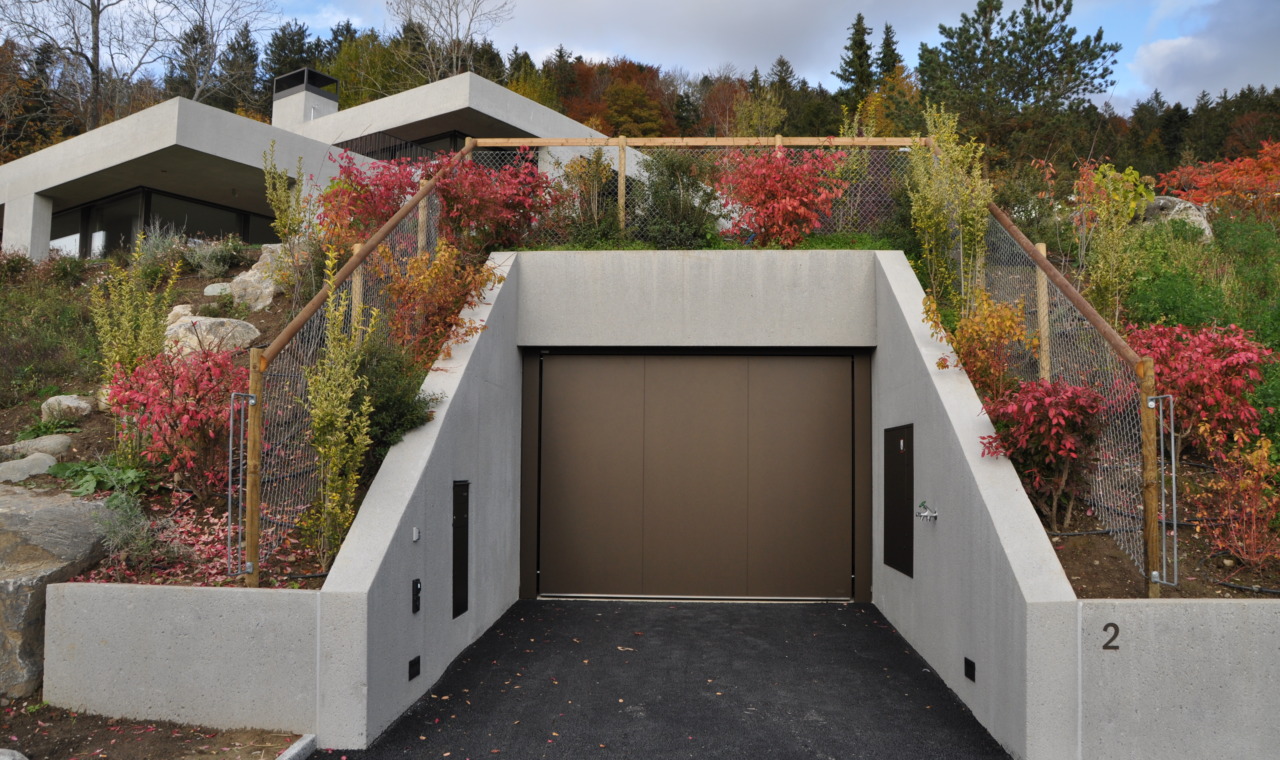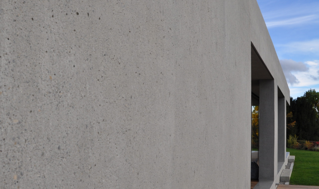 Das Haus Aeugst zeichnet sich durch seine exponierte Lage mit Panoramablick aus. Die prägnante Sichtbetonfassade in Kombination mit der zurückgesetzten Hebeschiebefront generiert eine überdeckte Loggia, die als räumliche Schnittstelle zwischen Innen- und Außenraum fungiert und den Landschaftsbezug architektonisch inszeniert.